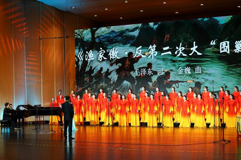 音乐会以毛泽东在江西创作或与江西紧密相关的经典诗词为重点,以历史事件时间为序编排。从《西江月・秋收起义》“军叫工农革命,旗号镰刀斧头”的激昂呐喊,到《沁园春・雪》“俱往矣,数风流人物,还看今朝”的哲思名句,中国革命在江西大地从星火燎原到走向胜利的征程如璀璨明珠般颗粒分明。八角之声合唱团以混声合唱、男声合唱、女声合唱、领唱与合唱等形式,让每一首承载着历史记忆的诗词在和声交织中焕发出独特的艺术魅力,生动勾勒出秋收起义号角、井冈山根据地创建、反“围剿”斗争等鲜活的历史场景,为观众刻画出一幅穿越时空的革命历史长卷。